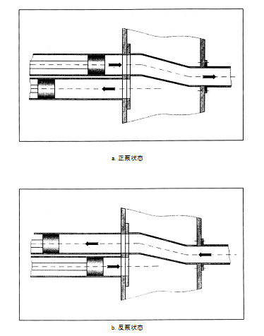 當混凝土活塞8后退至行程終端時,觸發(fā)水箱3中的換向裝置4,主油缸1、2換向,同時擺動油缸12、13換向,使分配閥10與混凝土缸6連通,混凝土缸5與料斗連通,這時活塞7后退,8前進。如此循環(huán),從而實現(xiàn)連續(xù)泵送。反泵時,通過反泵操作,使處在吸入行程的混凝土缸與分配閥連通,處在推送行程的混凝土缸與料斗連通,從而將管路中的混凝土抽回料斗(如圖所示)